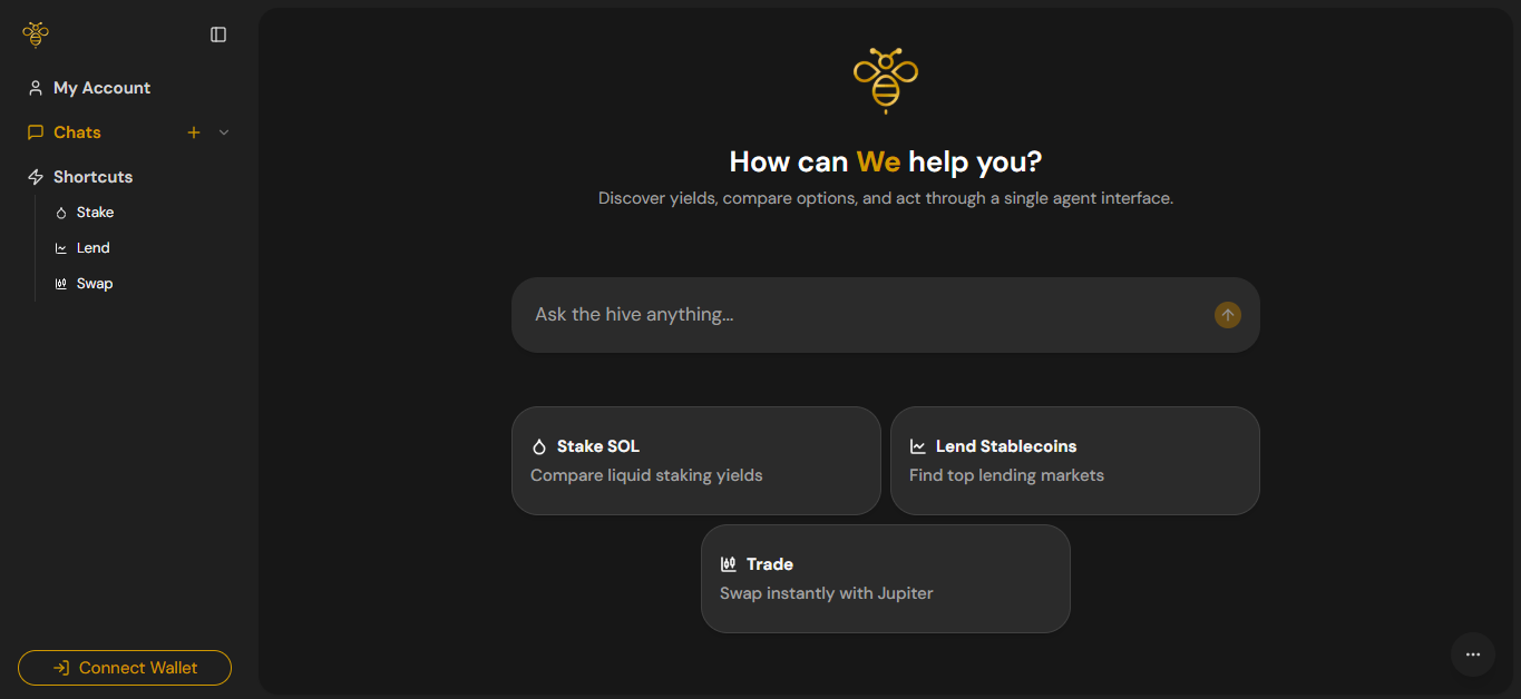 Hive AI, birbirleriyle koordineli çalışan, özel görevler için tasarlanmış, birbirine uyumlu on-chain ajanlardan oluşan bir ağ sunuyor. Kullanıcılar bu ajanları kullanarak karmaşık DeFi işlemlerini tek bir arayüz üzerinden yönetebiliyor. Hive’in amacı, DeFi dünyasında yatırım fırsatlarına erişim ile bu fırsatları yönetme zorluğu arasındaki boşluğu doldurmak.