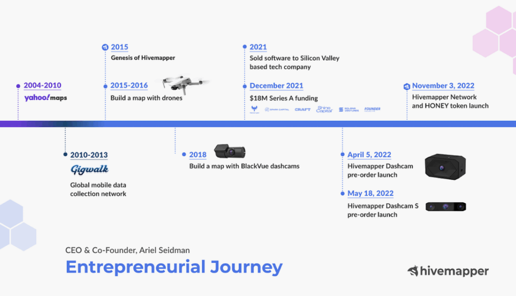 • 2022: Hivemapper Dashcam’in ön siparişe açılması ve ardından Hivemapper Ağı ile HONEY tokenının piyasaya sürülmesi.