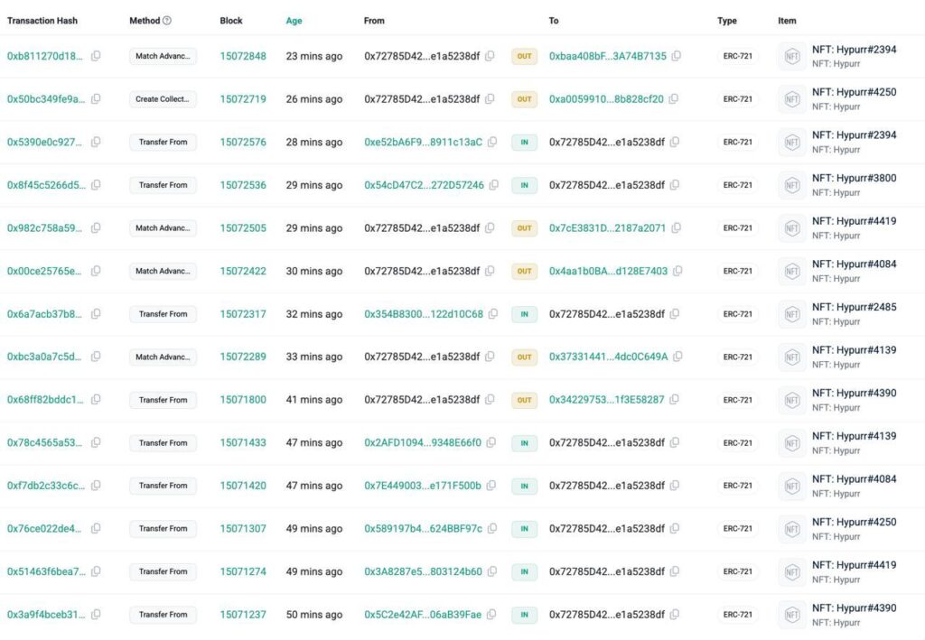 Saldırganın Hareketi: Sağlanan işlem kayıtları, saldırganın toplama ve satış cüzdanı olduğu düşünülen 0x72785D42…e1a5238df adresi üzerindeki olağanüstü aktiviteyi gözler önüne seriyor. Bu adrese, 50 dakika ile 23 dakika önce arasında çok sayıda Hypurr NFT (#2394, #4419, #4084, #4250 gibi) farklı cüzdanlardan Transfer IN olarak gelmiştir.