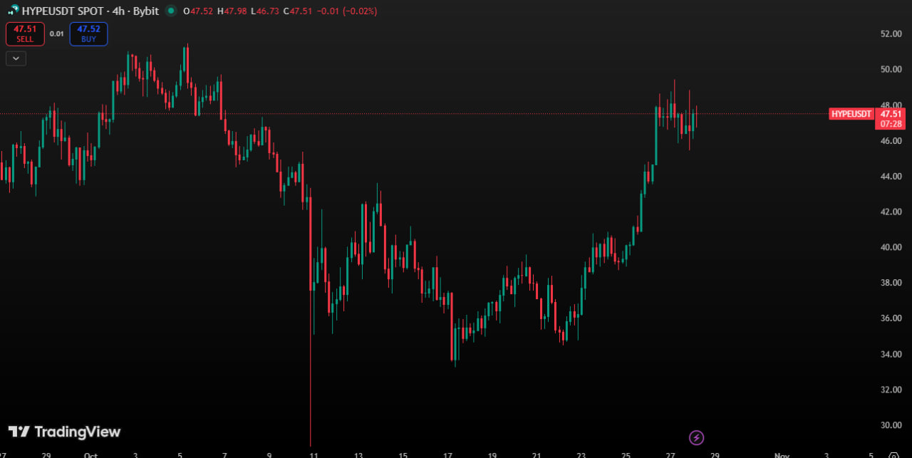 Olay sonrası HYPE fiyatı 47,8 dolar civarına geri döndü. Lighter’ın güncel grafiklerinde 98 dolarlık fitil artık görünmüyor; grafik yeniden dengeli bir fiyat hareketi yansıtıyor.
