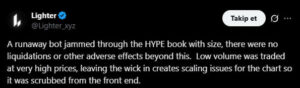 Ancak Lighter ekibi, bu ani yükselişin gerçek bir piyasa hareketi değil, arızalı bir botun işlem hatası olduğunu açıkladı. Ekip, “Kaçak bir bot, HYPE emir defterini boyutuyla karıştırdı.” ifadelerini kullanarak olayı doğruladı.