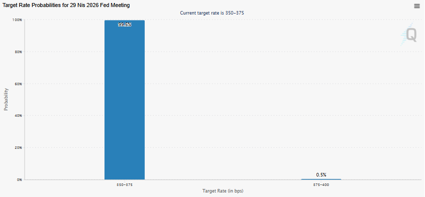 ABD tarafında ise para politikası beklentileri giderek daha netleşiyor. 29 Nisan 2026 itibarıyla piyasa fiyatlamaları, Federal Reserve’in (Fed) politika faizini %3.50–%3.75 aralığında sabit tutma ihtimalini %99,5 olarak gösteriyor. Daha yüksek faiz senaryosu ise oldukça düşük bir olasılık olarak değerlendiriliyor.