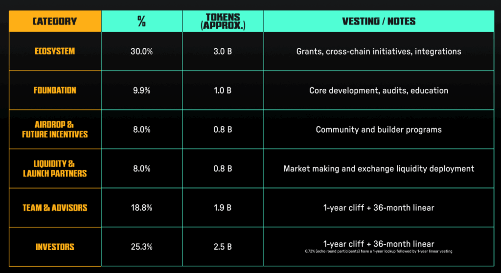 Yatırımcılar: %25.3 (~2.5 B) – 1 yıllık kilitlenme + 36 aylık doğrusal serbest bırakma (Alpha round katılımcılarının %0.72’si farklı vesting)