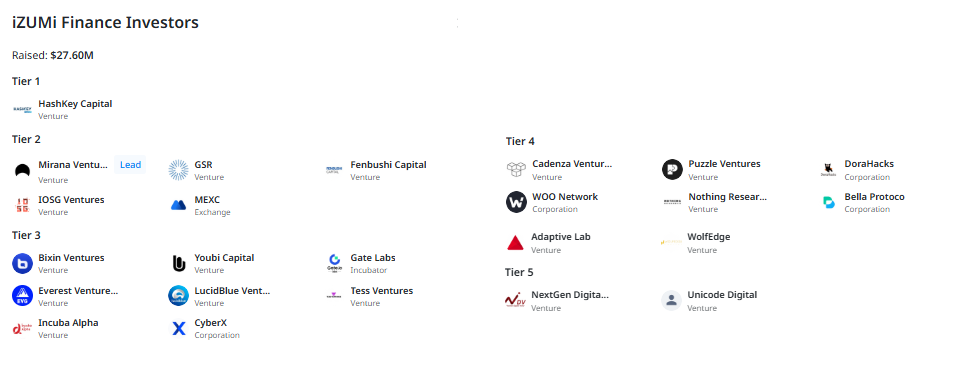 iZUMi Finance, erken dönemden itibaren güçlü kurumsal yatırımcıların dikkatini çeken bir proje oldu. DeFi alanında adı bilinen fonlardan alınan destek, protokolün hem teknik altyapısına hem de uzun vadeli vizyonuna duyulan güveni gösteriyor. Aşağıda yatırımcılar, katkı seviyelerine göre tier (katman) modelinde sıralanmıştır: