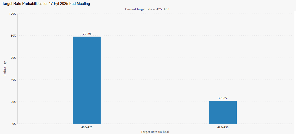 FedWatch Tool verilerine göre, piyasalarda faiz indirimi ihtimalleri şu şekilde fiyatlanıyor: 375-400 baz puan aralığı için ihtimal %0, 400-425 baz puan aralığı için ihtimal %79,2, mevcut seviye olan 425-450 baz puan aralığında ise %20,8 olasılık bulunuyor.