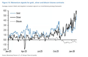 JPMorgan analistleri, momentum göstergelerinin Bitcoin, altın ve gümüş arasında belirgin bir ayrışmaya işaret ettiğini vurguluyor. Rapora göre Bitcoin vadeli işlemleri aşırı satım bölgesinde bulunurken, altın vadeli işlemleri aşırı alım, gümüş vadeli işlemleri ise güçlü şekilde aşırı alım seviyelerinde işlem görüyor. Bu tablo, yatırımcı tercihlerinde kripto varlıklardan değerli metallere doğru bir kaymaya işaret ederken, özellikle trend takip eden yatırımcılar ve emtia ticaret danışmanları açısından kısa vadede kâr realizasyonu ve sınırlı fiyat düzeltmesi riskini de beraberinde getiriyor.