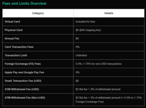 - ATM çekim işlemleri: 3 dolar sabit ücret + %2 işlem komisyonu uygulanır. Bu oran, çekim yapılan ülke ve para birimine göre değişebilir.