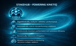 Kinetiq’in en kritik bileşenlerinden biri StakeHub sistemidir. Bu yapı, validator seçimini tamamen otomatik hale getirerek kullanıcıyı teknik karmaşıklıktan kurtarır ve staking sürecini çok daha verimli hale getirir. Geleneksel staking’de kullanıcıların validator araştırması yapması ve performansı sürekli takip etmesi gerekirken, StakeHub bu süreci tamamen arka planda yönetir.