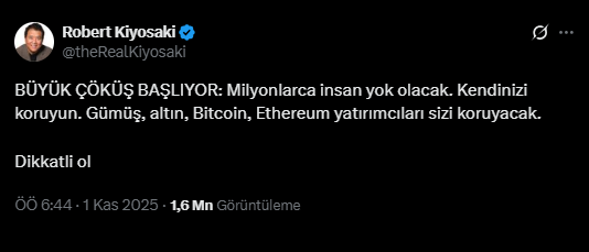 Kiyosaki, 2,8 milyondan fazla takipçiye sahip X (eski adıyla Twitter) hesabı üzerinden yaptığı paylaşımda, Kasım ayında ciddi bir piyasa düzeltmesi yaşanabileceğini belirtti. Ünlü yazar, bu süreçte özellikle geleneksel yatırım araçlarına (hisse senetleri, tahviller ve banka mevduatları) yönelenlerin büyük kayıplar yaşayabileceğini ifade etti.