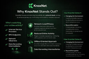 KnoxNet’in iddiası yalnızca gizlilik sunmak değil, aynı zamanda bunu ağ düzeyinde izlenebilirliği azaltarak yapmak. Projeye göre her zaman çevrimiçi olan sistemlerde gizlilik eksikliği genellikle bozuk kriptografiden değil, sistemin doğasından kaynaklanıyor. Çünkü bir işlem şifrelenmiş olsa bile, işlemin gerçekleştiği zaman, kullanıcının aktivite sıklığı, ağ yayılım davranışı ve bağlantı verileri gibi metaveriler hala görülebiliyor.
