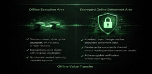 • Çevrimdışı Yürütme Alanı: Bu alanda cihazlar Bluetooth, Wi-Fi Direct veya yerel mesh ağları gibi yöntemlerle birbirleriyle doğrudan iletişim kurabiliyor. İşlem anında küresel koordinasyon gerekmiyor. Yani işlem internet üzerinden yayınlanmıyor, kamu ağlarından geçmiyor ve ortak bir deftere gerçek zamanlı olarak yazılmıyor. Bu da özellikle işlem anında ortaya çıkabilecek metaveri sızıntısını ciddi ölçüde azaltıyor. Böylece kullanıcılar, daha özel ve daha az izlenebilir bir işlem deneyimi yaşayabiliyor.