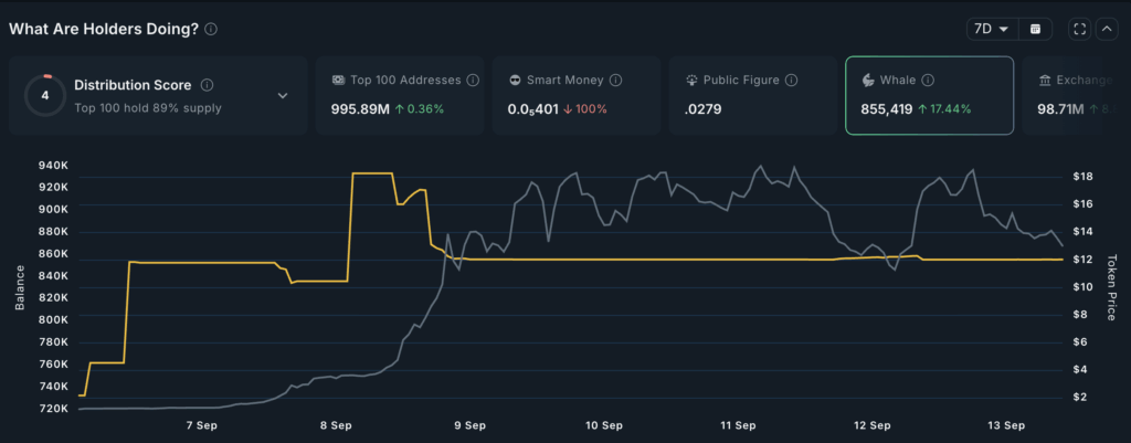MYX, geçen hafta %1.000’lik yükselişle dikkat çekti. Balinalar, 22,21 milyon token’a ulaşarak toplam pozisyonlarını %17 artırdı. MYX’in değeri bu yükselişle 14,95 dolara yaklaştı. Bununla birlikte, yatırımcılar olası geri çekilmeleri de göz önünde bulunduruyor.