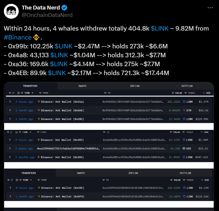 Chainlink (LINK) balinaların dikkatini çeken diğer bir token oldu. Son 24 saatte LINK %5,9 değer kazandı. Dört balina Binance’den toplam 400.000’den fazla LINK çekti ve yaklaşık 9,82 milyon dolar değerinde işlem yaptı. Bu arada, bir balina 211.346 LINK daha çekti ve toplam LINK miktarını 932.640’a çıkardı.