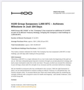 Son alımla birlikte H100 Group’un toplam Bitcoin varlıkları 1.004,56 BTC seviyesine ulaştı. Bu, şirketin kripto piyasasında kilit bir oyuncu haline geldiğinin göstergesi oldu.