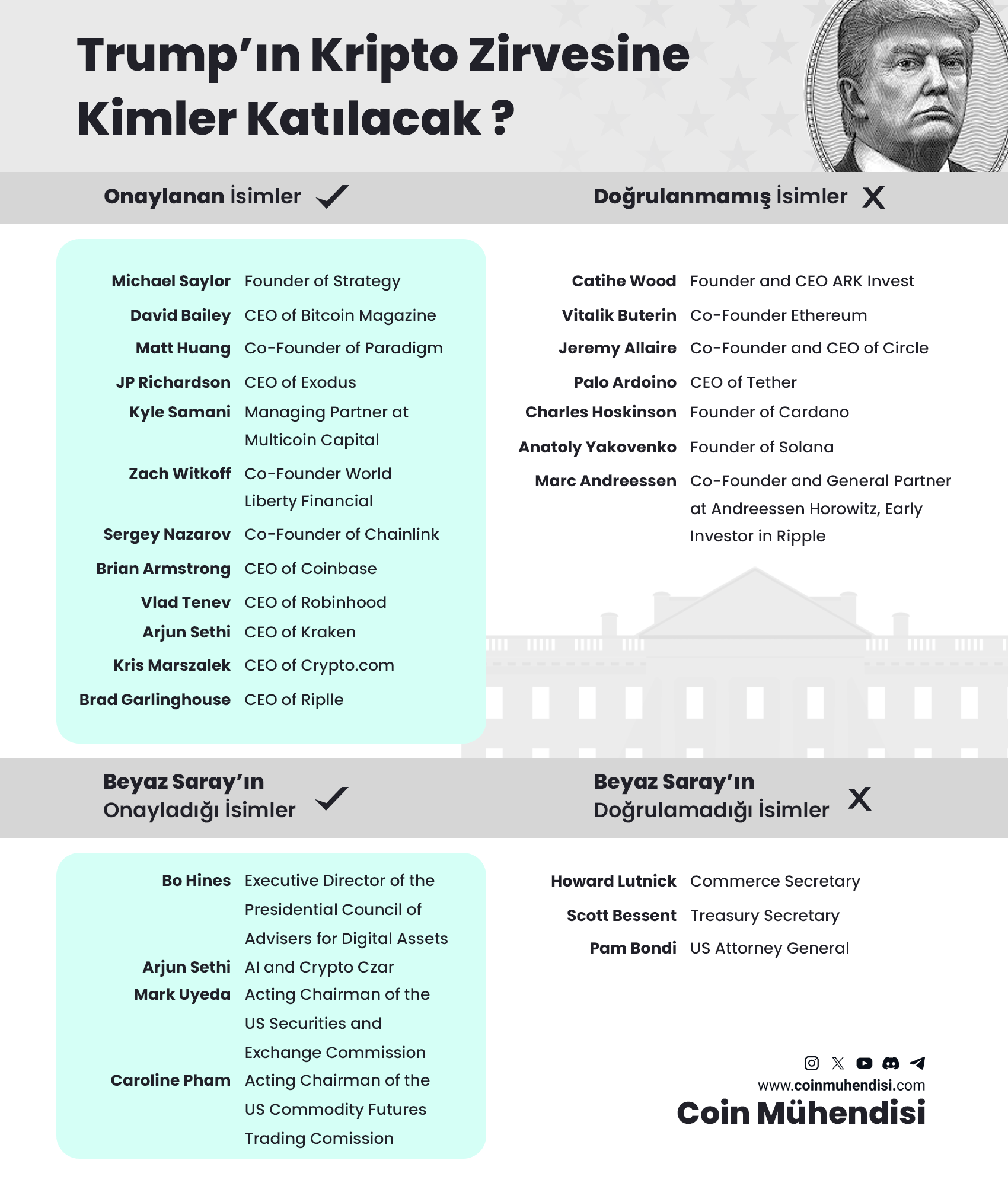 Beyaz Saray’daki toplantıya 25’ten fazla sektör lideri ve Başkanlık Dijital Varlıklar Çalışma Grubu üyeleri katılacak. İşte zirvede bulunacak bazı önemli isimler: