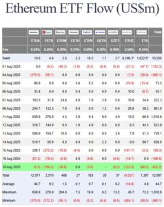 Ethereum yatırımcıları 19 Ağustos’ta önemli bir satış dalgası yaşadı. Spot ETF’lerden toplam 422,30 milyon dolar çıkış kaydedildi. Bu, Ethereum piyasasında yatırımcı güveninde zayıflamaya işaret edebilecek bir gelişme olarak değerlendiriliyor.
