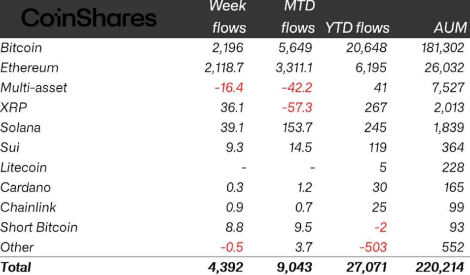 Kripto yatırım ürünleri, geçtiğimiz hafta rekor düzeyde 4,4 milyar dolarlık fon girişi ile dikkat çekti. Bu gelişmeyle birlikte, 2025 yılı toplam kripto ETP girişleri 27 milyar dolara ulaştı. Aynı dönemde, yönetim altındaki toplam varlıklar (AUM) ise ilk kez 220 milyar doları aştı.