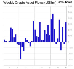 Kripto yatırım fonları, geçen hafta güçlü bir toparlanma kaydederek 3,3 milyar dolarlık net giriş gördü. CoinShares’in haftalık raporuna göre, bu girişlerle birlikte fonlarda yönetim altındaki varlıklar (AuM) 239 milyar dolara yükseldi ve Ağustos başındaki 244 milyar dolarlık rekor seviyeye yeniden yaklaştı.