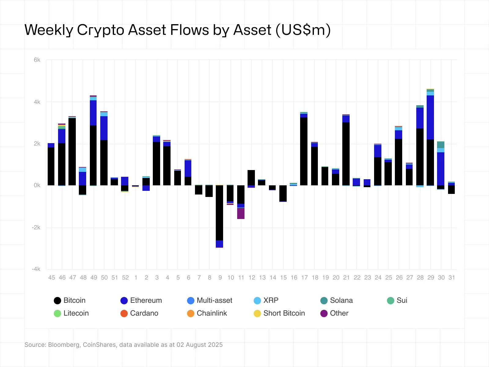 Haftalık verilere göre, XRP, Solana ve Sui odaklı yatırım ürünleri de haftayı artıda kapattı. XRP fonlarına 31.2 milyon dolar, Solana’ya 8.8 milyon dolar, Sui’ye ise 5.8 milyon dolarlık giriş oldu.