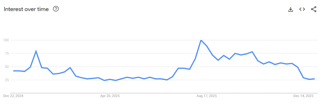 Kripto Google arama hacmi, 2025’in sonuna yaklaşılırken hem küresel ölçekte hem de ABD’de yılın en düşük seviyelerine geriledi. İnternette yapılan aramalar, yılın başındaki yüksek ilginin aksine, perakende yatırımcıların kripto piyasasından uzaklaştığını gösteriyor. Dijital ilginin zayıflaması, piyasadaki güven kaybının hâlâ telafi edilemediğine işaret ediyor. Google Trends verilerine göre kripto arama hacmi (crypto search volume) yılın dip seviyelerine yakın seyrediyor.