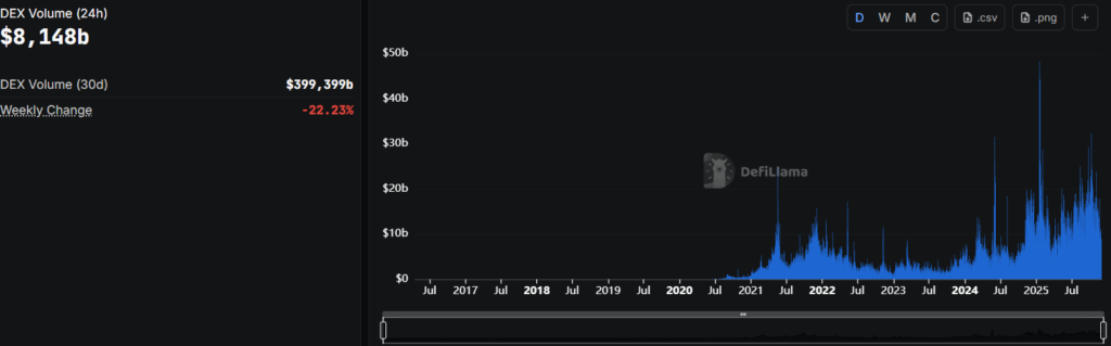 Kasım’da merkeziyetsiz borsalardaki toplam hacim 397.7 milyar dolara kadar gerileyerek son altı ayın en düşük seviyesine indi. Uniswap ve PancakeSwap gibi büyük protokollerde yaşanan düşüş, DeFi tarafındaki teşvik mekanizmalarının yatırımcı ilgisini taşımakta zorlandığını gösterdi. Daralan işlem aralıkları ve azalan spekülatif akış, merkeziyetsiz ticaretin rotasını da etkiledi ve CEX lehine bir hacim kayması yarattı.