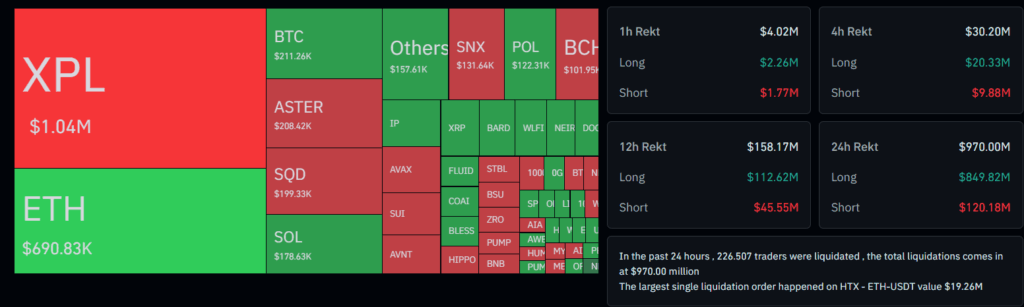 Son 1 saatte toplam likidasyon 4,02 milyon dolar olurken, bunun 2,26 milyon doları long ve 1,77 milyon doları short pozisyonlardan geldi. Son 4 saatte toplam likidasyon 30,20 milyon dolar olarak kaydedildi; long pozisyonlar 20,33 milyon dolar ile short pozisyonlara göre belirgin şekilde yüksekti. Son 12 saatte toplam likidasyon 158,17 milyon dolar seviyesine ulaştı ve long pozisyonlar 112,62 milyon dolarla short pozisyonların iki katından fazla oldu. Son 24 saatte ise likidasyonlar 970 milyon doları buldu ve bu miktarın büyük çoğunluğu, 849,82 milyon dolar ile long pozisyonlardan kaynaklandı.