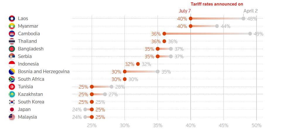 ABD Başkanı Donald Trump, 7 Temmuz’da 14 ülkeye %25-40 arasında yeni gümrük vergileri mektupları gönderdi. İlk mektuplar Güney Kore ve Japonya’ya ulaştı. Trump, daha sonra 12 ülkeye daha benzer tarife mektupları gönderdi. Bu ülkeler arasında Tunus, Kazakistan, Sırbistan, Bosna, Myanmar, Laos, Bangladeş, Malezya, Kamboçya, Tayland, Endonezya ve Güney Afrika yer aldı. Trump, ticaret açıkları konusunda endişelerini vurguladı ve misilleme halinde yeni tarifelerin gelebileceğini bildirdi.