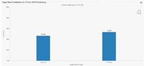 Buna ek olarak Fed’in Aralık ayında yapacağı faiz kararı konusunda ciddi bir belirsizlik bulunuyor. Faiz indirimi beklentilerinin zayıflaması, Bitcoin gibi riskli varlıkları baskı altında tutuyor. CME Group verilerine göre şu an için Fed’in Aralık ayında faiz indirmeme ihtimali %57 seviyesine çıkmış durumda.