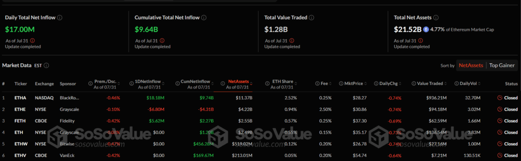 Ethereum ETF’lerine 17 Milyon Dolarlık Giriş
