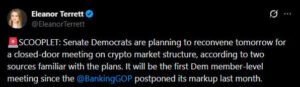 ABD Senatosu’nda kripto piyasalarının yapısını düzenlemeyi amaçlayan yasa tasarısı, bugün yeniden gündeme alınıyor. Eleanor Terrett’in paylaştığı bilgilere göre, Senato’daki Demokrat üyeler kripto piyasa yapısına ilişkin tasarıyı ele almak üzere kapalı kapılar ardında bir toplantı gerçekleştirmeyi planlıyor. Bu görüşmenin, tasarının geleceğine dair Demokrat kanadın ortak bir tutum belirlemesi açısından kritik olduğu değerlendiriliyor.