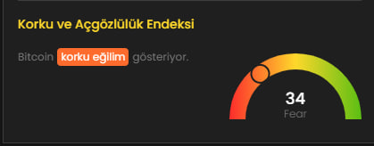 Bu veriler, yatırımcıların kısa vadede riskten kaçınma eğilimine girdiğini açıkça ortaya koyuyor. Korku ve Açgözlülük Endeksi şu anda 34 seviyesinde, yani piyasada “korku” hakim.