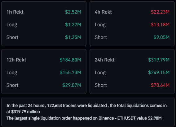 Kripto piyasası haftaya sert düşüşlerle başladı. Son 24 saat içinde Bitcoin 108.000 doların altına, Ethereum ise 4.000 dolar seviyesinin altına gerileyerek yatırımcıları tedirgin etti. Piyasa genelinde sert bir satış dalgası yaşanırken, 24 saat içinde toplam 319 milyon dolarlık likidasyon gerçekleşti. Bu tasfiyelerin 249 milyon dolarlık kısmı long (alış yönlü) pozisyonlardan oluştu; bu da yatırımcıların düşüşe hazırlıksız yakalandığını gösteriyor.