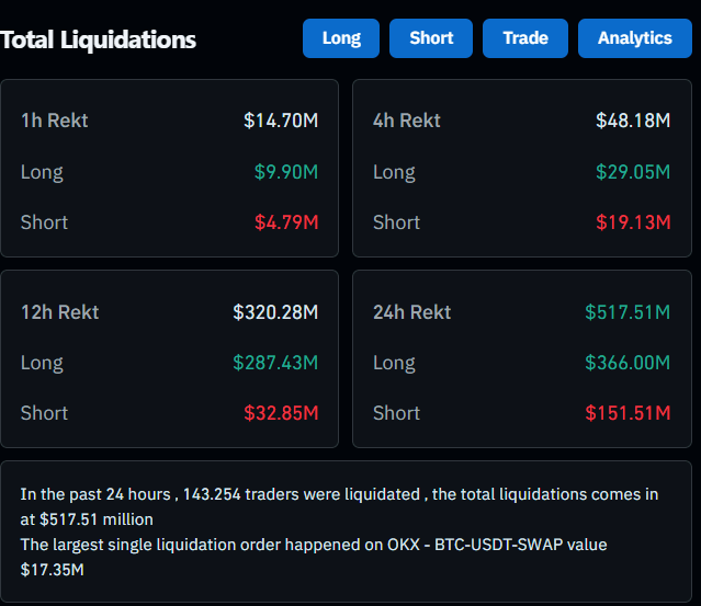 Kripto para piyasaları, 24–25 Temmuz arasında sert dalgalanmalara sahne oldu. Son 24 saatlik verilere göre toplam 517,51 milyon dolarlık pozisyon likide oldu. Kaldıraçlı işlem yapan 143.254 trader bu sert hareketlerden olumsuz etkilendi. Yüksek volatilite, özellikle uzun pozisyon taşıyanları hedef aldı.