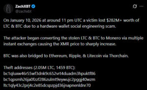 Blockchain araştırmacısı ZachXBT’ye göre, bir kullanıcı donanım cüzdanı üzerinden gerçekleştirilen sosyal mühendislik saldırısı sonucunda 282 milyon dolardan fazla BTC ve LTC kaybetti. Saldırgan, ele geçirilen varlıkların bir kısmını Monero (XMR)’a çevirerek XMR fiyatında ani bir sıçramaya yol açtı. Ayrıca saldırganın, THORChain üzerinden 818 BTC’yi (yaklaşık 78 milyon dolar) 19.631 ETH, 3,15 milyon XRP ve 77.285 LTC’ye dönüştürdüğü bildirildi. Bu olay, blockchain güvenliği ve cüzdan koruması konusunda yatırımcıların dikkatli olması gerektiğini bir kez daha gösterdi.