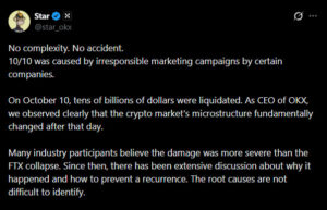 Kripto piyasasının kendi iç dinamikleri de son düşüşün derinleşmesinde etkili olmuş olabilir. Son günlerde birçok etkili piyasa ismi, mevcut geri çekilmenin Binance’te 10 Ekim tarihinde yaşanan teknik sorunlar ve büyük çaplı tasfiyelerle bağlantılı olabileceğini öne sürüyor. Bu süreçte özellikle türev piyasalarda gerçekleşen zorunlu likidasyonların, piyasadaki likiditeyi zayıflattığı ve satış baskısını hızlandırdığı ifade ediliyor.