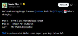 Kripto dünyasının önde gelen NFT platformlarından Magic Eden, Bitcoin ve Ethereum ekosistemini yakından ilgilendiren önemli bir stratejik karar aldı. Platformun, 2026 Mart ayının ilk haftasında Bitcoin ve Ethereum Sanal Makinesi (EVM) pazar yerlerini kapatma kararı aldığı bildirildi. Bu adım, şirketin Solana odaklı yeni stratejiye yöneldiğini gösteriyor. Blockspace’e konuşan kaynaklara göre Magic Eden yalnızca BTC ve ETH pazar yerlerini kapatmakla kalmayacak, aynı zamanda çapraz zincir cüzdan desteğini de sonlandıracak. Buna karşın Solana tabanlı varlıklar ve NFT’ler için destek devam edecek.