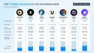 - Aster (ASTER): Aster için planlanan token kilidi açma işlemi 17 Aralık tarihinde gerçekleşecek. Bu süreçte 78,41 milyon ASTER token dolaşıma girecek. Kilidi açılacak tokenların toplam piyasa değeri yaklaşık 75,36 milyon dolar seviyesinde bulunuyor.
