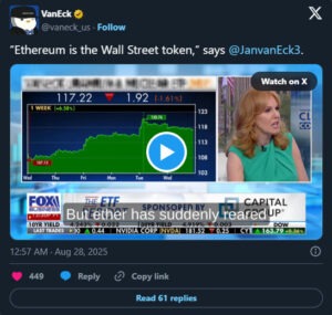 Yatırım yönetimi devi VanEck’in CEO’su Jan van Eck, Ethereum hakkında dikkat çeken açıklamalarda bulundu. Fox Business’a konuşan van Eck, bankaların ve finans kuruluşlarının stablecoin işlemlerini gerçekleştirmek için Ethereum’u tercih edeceğini ve bu nedenle ETH’nin “Wall Street token’ı” olacağını söyledi.