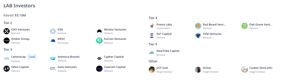 - Tier 3: Lemniscap, Animoca Brands, Cypher Capital, Selini Capital, Gate Ventures, Castrum Capital.