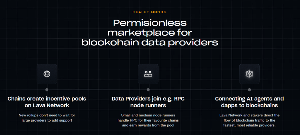 Lava, bu hizmetleri merkeziyetsiz bir pazar yeri aracılığıyla sunar. Geliştiriciler (Tüketiciler) veri talebinde bulunur, düğüm işleticileri (Sağlayıcılar) bu talepleri karşılar ve hizmet kalitesine (Hizmet Kalitesi – QoS) göre ödüllendirilir. Bu model, güvenilir, hızlı ve ölçeklenebilir bir altyapı sağlar.