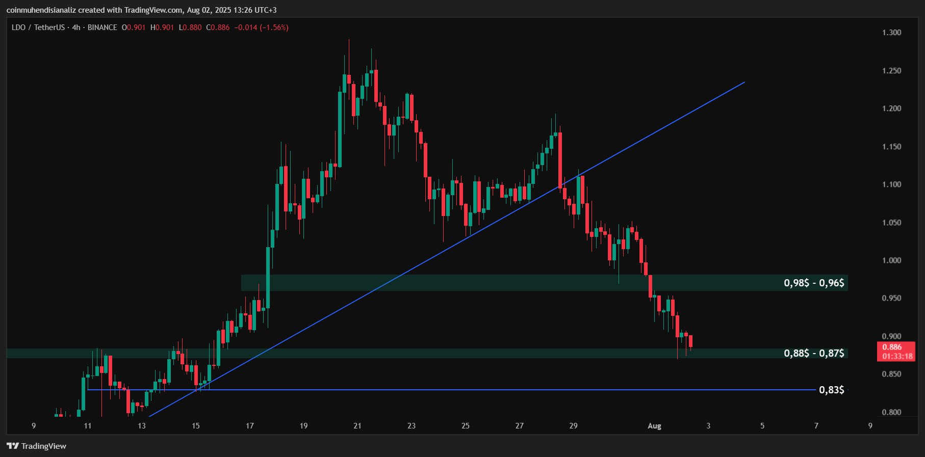 Geçtiğimiz günlerde LDO fiyatında düşen trend çizgisinin yukarı yönlü kırılması, yatırımcılar tarafından olumlu bir sinyal olarak algılandı. Ancak bu kırılım sonrasında beklenen yükseliş ivmesi gelmedi. Aksine, fiyat yeniden aşağı yönlü baskı altında kaldı ve 0,98$ – 0,96$ destek bölgesi kırıldı.