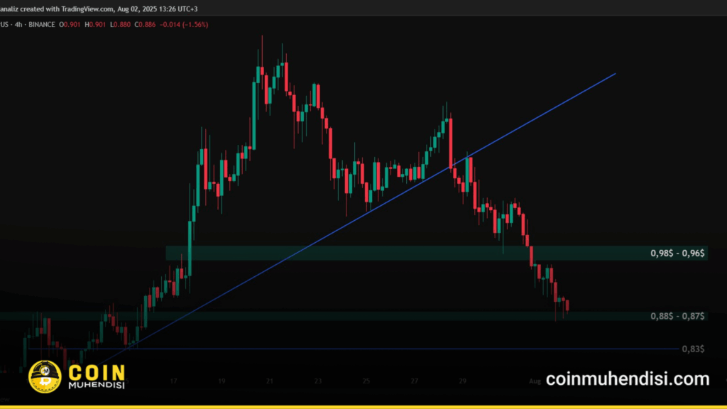Fiyatın gerilemesiyle birlikte 0,88$ – 0,87$ bölgesi, şu an için en yakın kısa vadeli destek konumuna gelmiş durumda. Bu bölge teknik açıdan oldukça önemli; çünkü alıcıların yeniden devreye girebileceği potansiyel bir nokta.