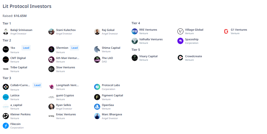 • Tier 3: Collab+Currency, LongHash, Protocol Labs, Lattice, gumi Cryptos, Figment, a_capital, Ryan Selkis, OpenSea, Kleiner Perkins, Eniac, Marc Bhargava, Filecoin