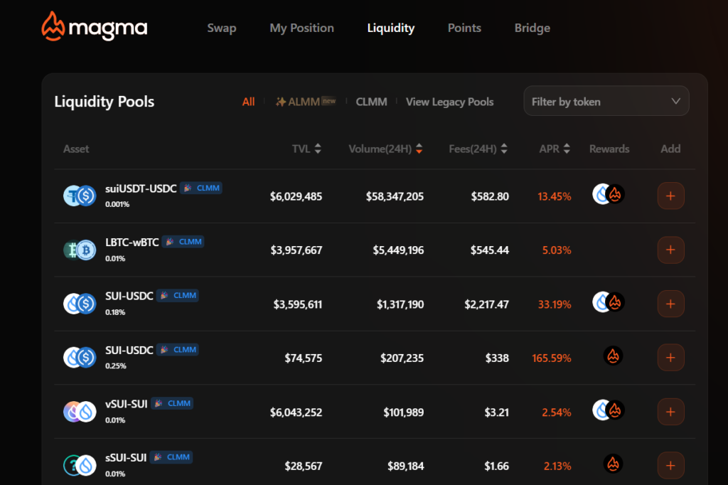 Magma’nın temel amacı, merkeziyetsiz ticareti ve likidite yönetimini optimize etmektir. Platform, kullanıcıların belirli fiyat aralıklarında likidite sağlayabilmesini mümkün kılan Concentrated Liquidity Market Maker (CLMM) teknolojisini kullanır. Bu sayede hem sermaye verimliliği artar hem de likidite sağlayıcılar daha yüksek ücret kazanabilir.