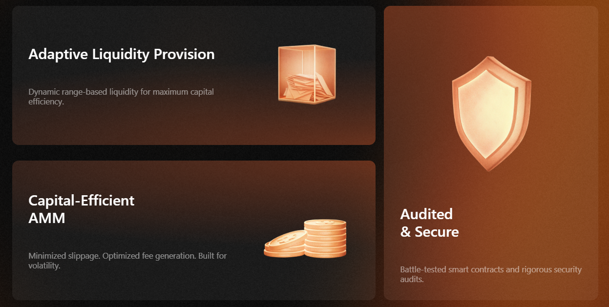 - Sermaye Verimli AMM: Slippage’ı minimize eder, işlem ücretlerini optimize eder ve volatiliteye göre tasarlanmıştır.