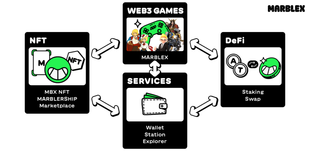 MARBLEX, blockchain oyun ekosistemi, DeFi ve NFT hizmetlerini bir araya getirerek kullanıcılarına bütünleşik bir deneyim sunar. Multichain desteği ile erişilebilirliği artırır, çok katmanlı hibrit yapısı ile yüksek performans sağlar ve token kullanımını oyun içi ve ekosistem çapında optimize eder. Platform, MMORPG, CCG, spor ve casual oyun türlerini destekleyerek kullanıcı deneyimini çeşitlendirir ve token ekonomisinin sürdürülebilirliğini güvence altına alır.