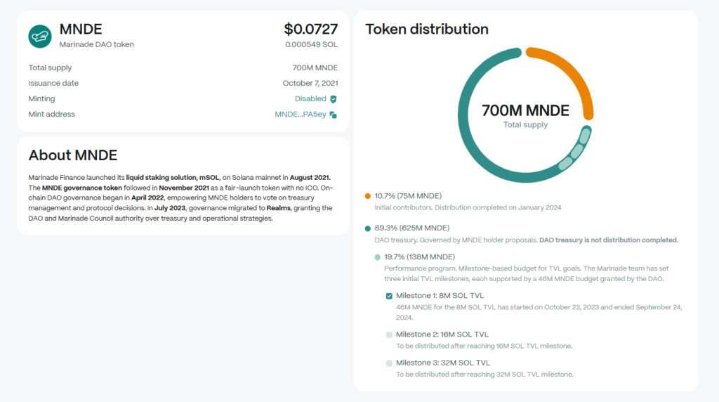 DAO Hazinesi: %89.3 (625 milyon MNDE). Topluluk tarafından yönetilir ve dağıtım devam etmektedir. Bu hazinenin %19.7’lik kısmı (138 milyon MNDE) Performans Programı için ayrılmıştır. Kilometre taşları: 8M SOL TVL için 46M MNDE (dağıtım başladı), 16M SOL TVL hedefi, 32M SOL TVL hedefi.