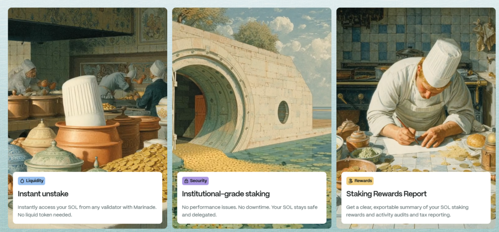 Marinade’nin öne çıkan özelliklerinden biri likit staking çözümüdür. Katılımcılar, staked SOL tokenleri karşılığında mSOL alır. mSOL, staked SOL’ü temsil eden ve değerini SOL’e yakın tutan bir token olup, kullanıcıların staked varlıklarından yield elde etmesini ve Solana DeFi ekosisteminde ek fırsatlar yaratmasını sağlar.