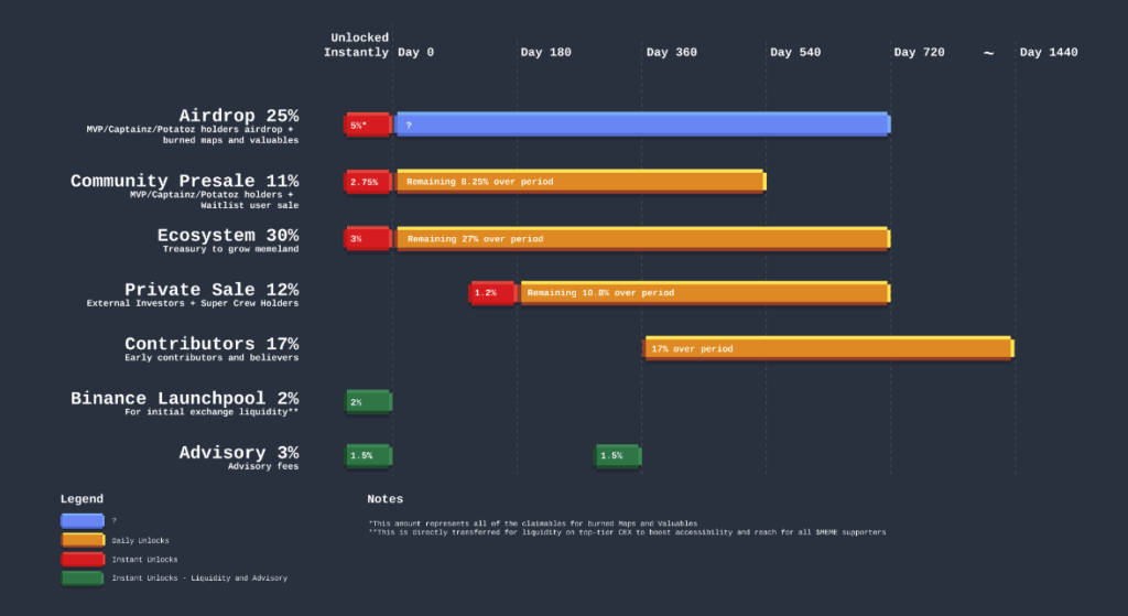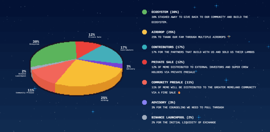 - Topluluk Ön Satışı (Community Presale): %11 – MEME’nin %11’i daha geniş Memeland topluluğuna bir “fire sale” aracılığıyla dağıtılmıştır.