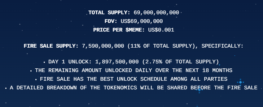 Meme Coin’in toplam arzı 69 milyar token’dır. 26 Ekim 2023 tarihinde gerçekleşen ön satışta sadece bir saat içinde 10 milyon dolardan fazla değerle MEME token satılmıştır. Ön satış fiyatı 0,001 dolar olarak belirlenmiştir.